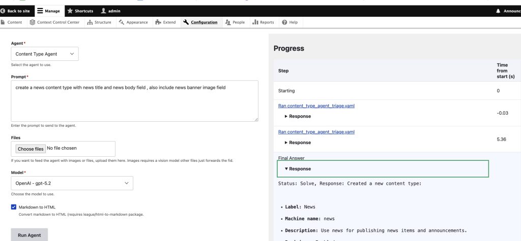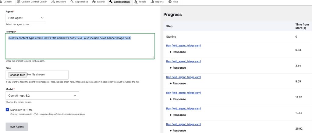 So for creating a field we have selected field Agent as below in Agent dropdown and provided prompt – “in news content type create news title and news body field , also include news banner image field.”