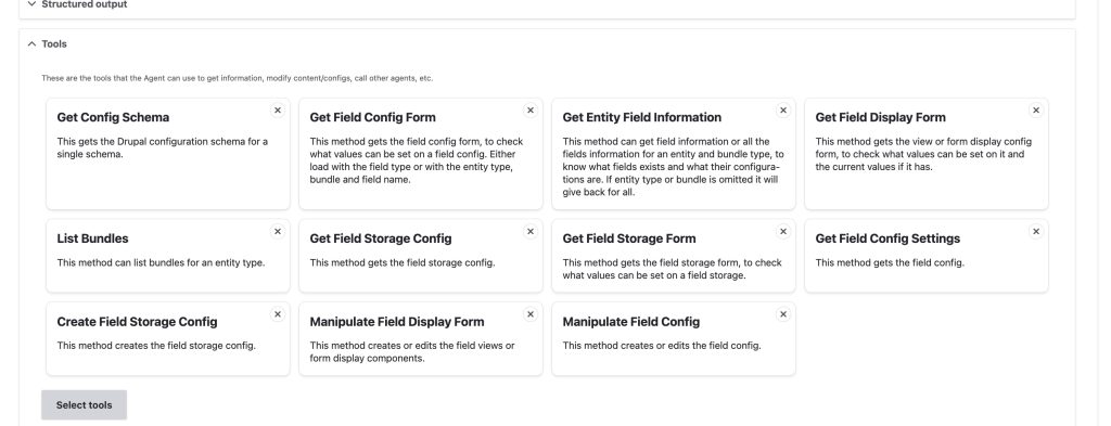 You can see above tools. These are built in tools already part of Dupal instance , Agent will use these tools to do the actions.